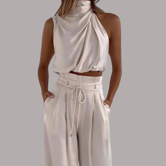 Silviana - Set elegant din două piese: top scurt fără mâneci și pantaloni cu talie înaltă, croi lejer
