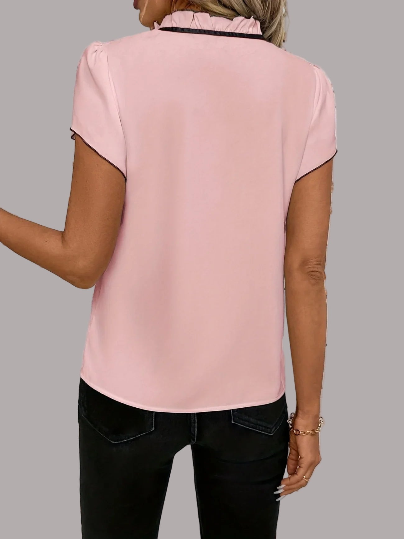 Siluetă cu mâneci moi: Mânecile scurte fluturate acoperă frumos brațele, păstrând în același timp un profil ușor și feminin. Acestea adaugă mișcare și echilibrează structura bluzei pentru un rezultat flatant. Aceste mâneci fac topul versatil și grațios pentru toate formele corpului. Este frumusețea în mișcare.
