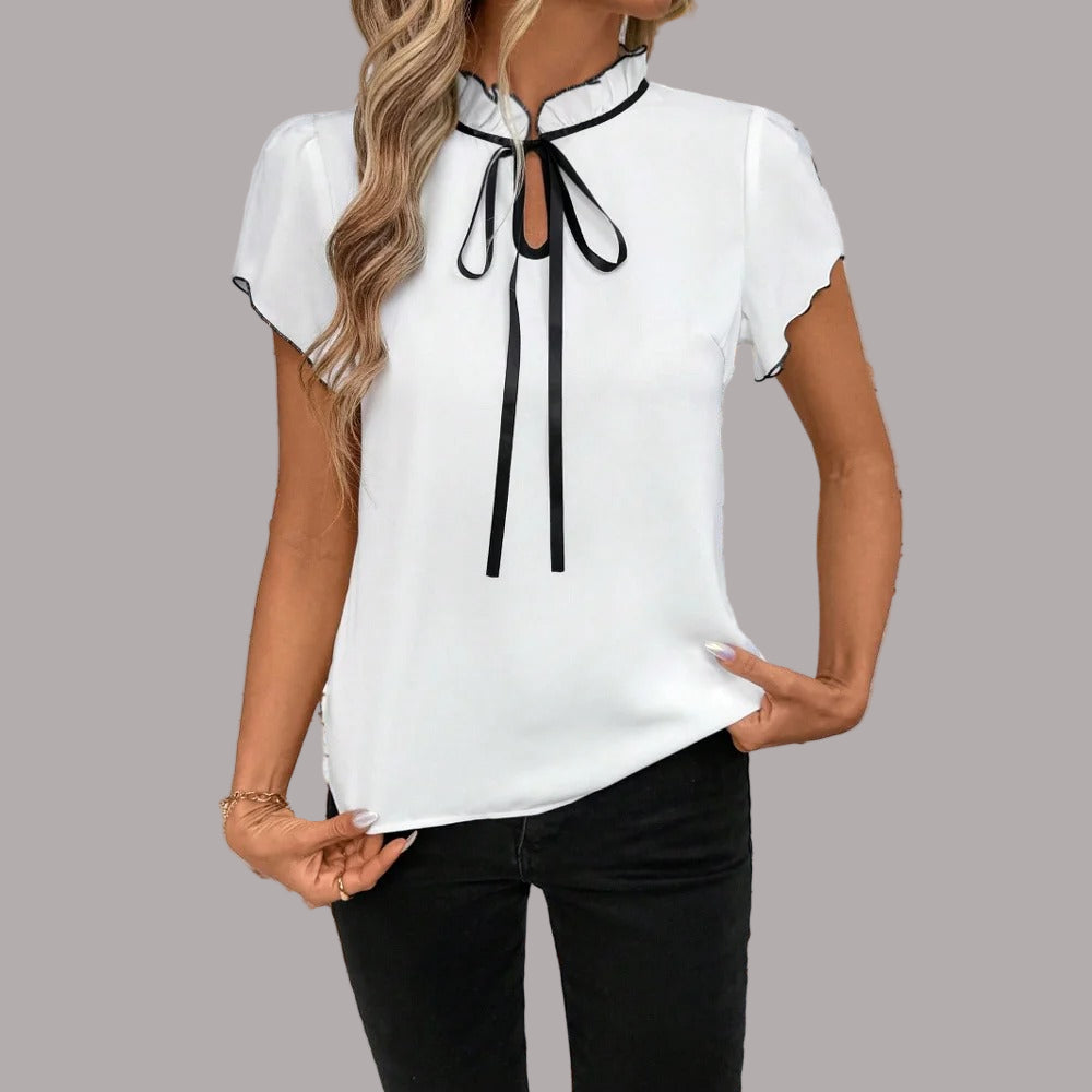 Contrast elegant și atrăgător: Cămașa Martina are o bordură neagră rafinată de-a lungul gulerului, mânecilor și a fundei de la decolteu, oferind un aspect elegant și sofisticat. Acest detaliu contrastant conferă dimensiune și un plus de rafinament oricărei ținute. Îți pune în valoare ținuta fără efort. Vei atrage toate privirile fără efort, în orice context.
